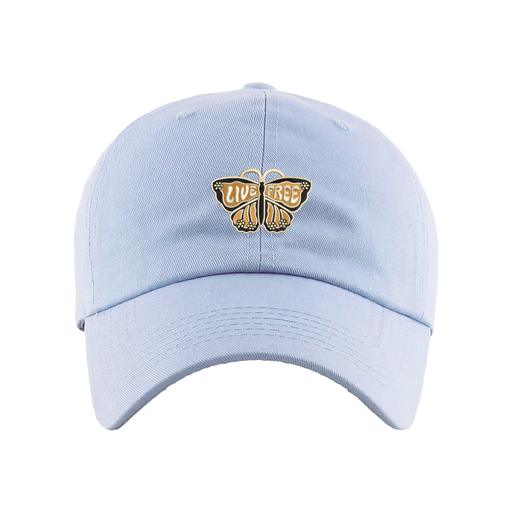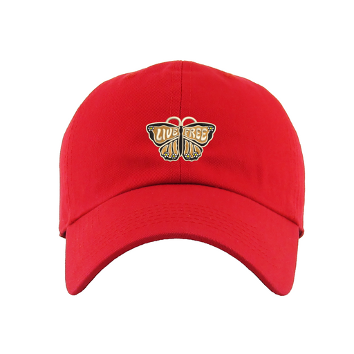 Live Free Dad Hat designed by Patches and Pins. Stay warm in the winter and cool this summer with our custom dad hats.