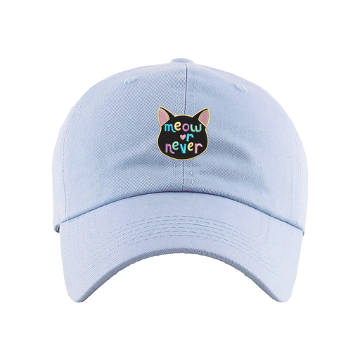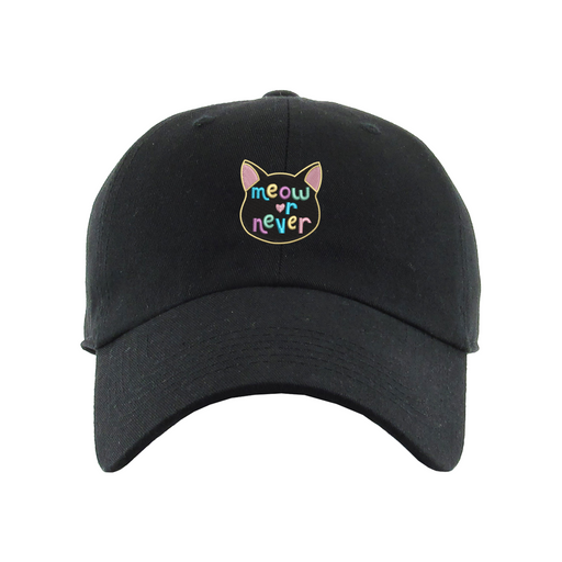 Meow or Never Dad Hat designed by Patches and Pins. Stay warm in the winter and cool this summer with our custom dad hats.