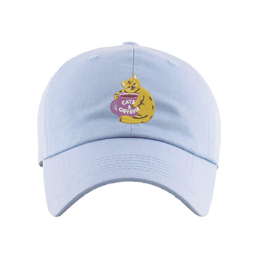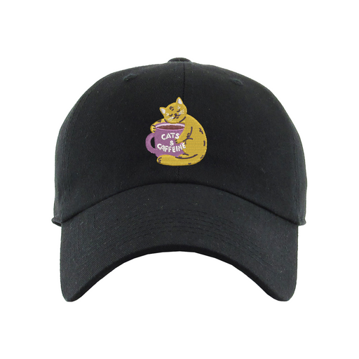 Cats & Caffeine Dad Hat designed by Patches and Pins. Stay warm in the winter and cool this summer with our custom dad hats.
