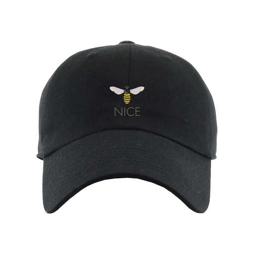 Bee Nice Dad Hat designed by Patches and Pins. Stay warm in the winter and cool this summer with our custom dad hats.
